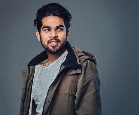 Handsome man. Young bearded handsome man in grey looking thoughtful