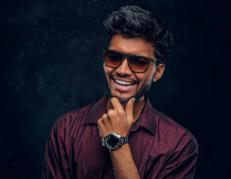 Vogue, fashion, style. Cheerful young Indian guy wearing a stylish shirt and sunglasses posing with hand on chin. Studio photo against a dark textured wall