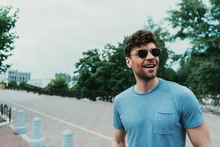 Close up portrait of caucasian bearded man face with white skin, smile look at camera open and confident. Guy wide smiling with healthy white teeth. Portrait of caucasian european male.