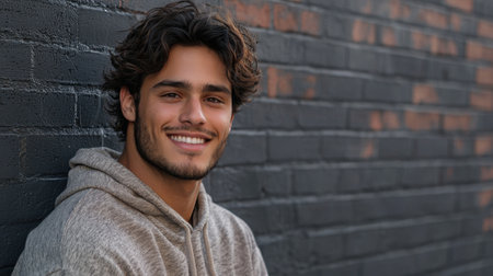 A young man with curly hair and an engaging smile is casually leaning against a black brick wall. He is dressed in a comfortable hoodie, radiating warmth and confidence.