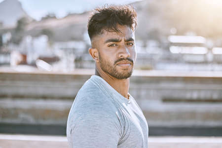 Attractive young man with dark hair and modern hairstyle wearing casual clothes outdoors