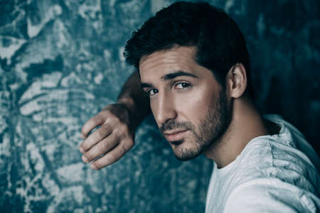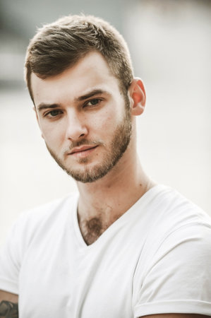 Close-up portrait of a handsome young man with brave manly face. Male beauty, cosmetics.