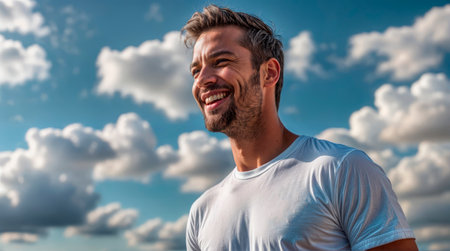 A cheerful young cute man 30 years old, resident of USA, with short hair and a well-kept beard smiles warmly while wearing a casual wear. Soft lighting enhances the friendly atmosphere. Generative AI.