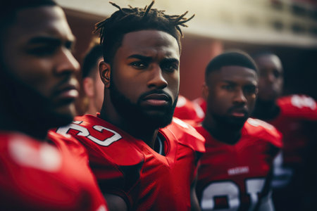 Close-up of American football players standing together on the field, showing determination and teamwork during an autumn game.