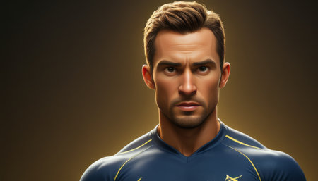 AI Generated. Young athlete poses confidently on the field during twilight with stadium lights illuminating the background