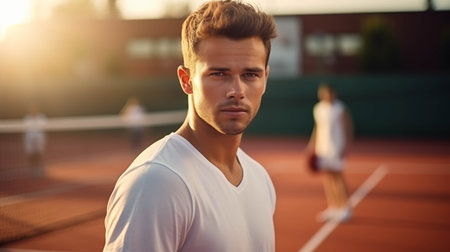 Young Caucasian man is confident playing tennis on the court.