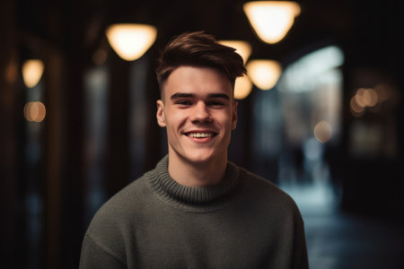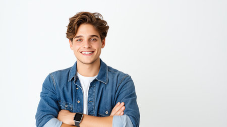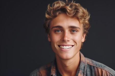 A bright and engaging studio portrait of a young white American male model, showcasing a joyful smile with perfect teeth, casual yet stylish attire