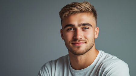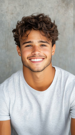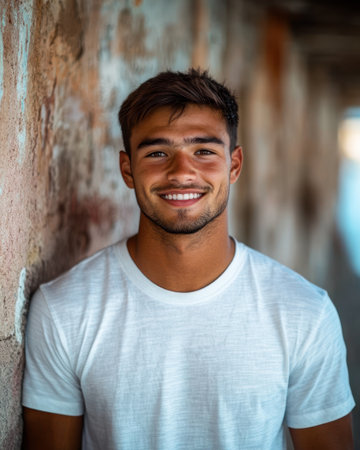 A young man stands in front of a muted wall, wearing a relaxed t-shirt. His confident gaze and gentle smile convey a sense of ease and approachability, illuminated by natural light.