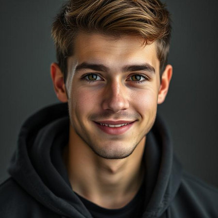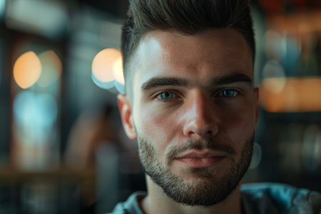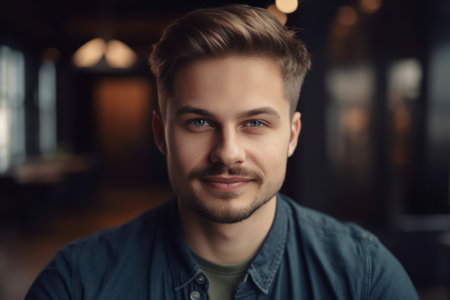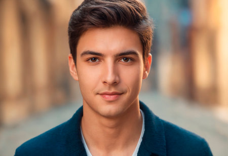 A captivating portrait of a young man with striking blue eyes and a casual style. The image captures a warm and engaging expression, perfect for various themes.