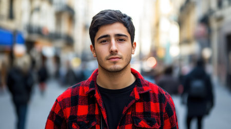 A young man stands confidently in a bustling city street, showcasing a modern urban lifestyle. The blurred background adds vibrancy to the scene.