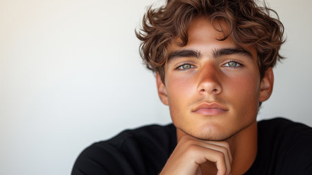 Modern and minimalist portrait of a young man with tousled wavy hair, wearing a simple black t shirt against a plain background