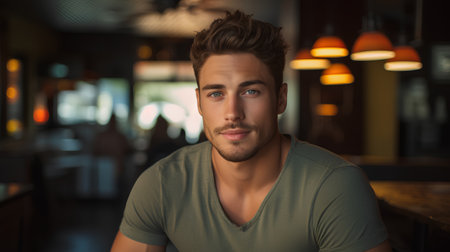 Handsome young man in casual clothes is looking at camera and smiling while sitting in cafe