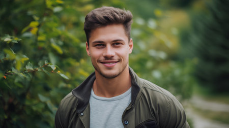 A handsome young man with short tousled hair, dressed in a casual button-up shirt, smiles warmly at the camera, exuding friendliness and approachability suitable for lifestyle or casual themes.