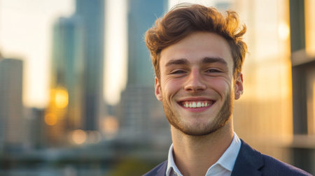 Close-up of a young businessman smiling confidently while standing in front of a city skyline, reflecting success and ambition in his professional journey.
