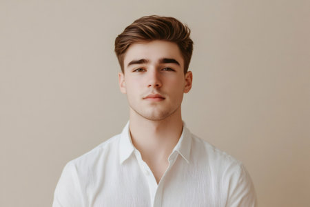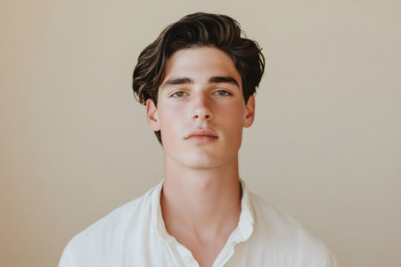 Modern and minimalist portrait of a young man with styled hair and freckles, wearing a white shirt against a neutral background