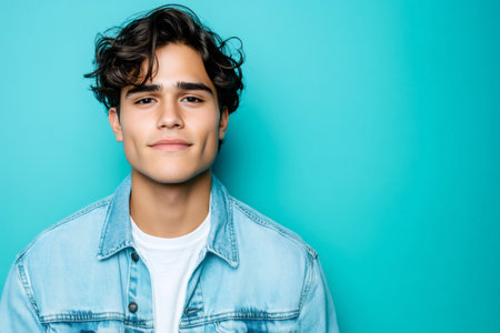 Young Hispanic man smiling, looking at camera with confidence. Wearing a casual denim jacket against turquoise background