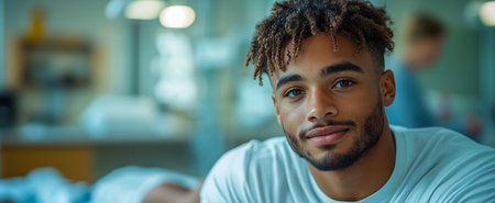 A young man with curly hair smiling warmly in a contemporary indoor environment