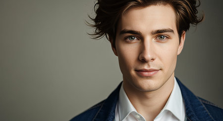 Captivating portrait of a young man with soft features and striking blue eyes, conveying confidence and charm against a neutral backdrop.
