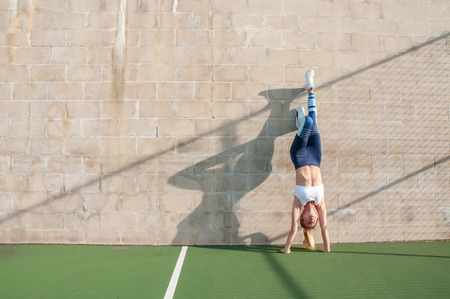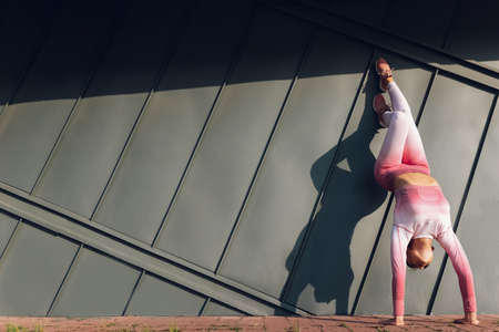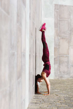 Athetic girl doing handstand against the wall on the street