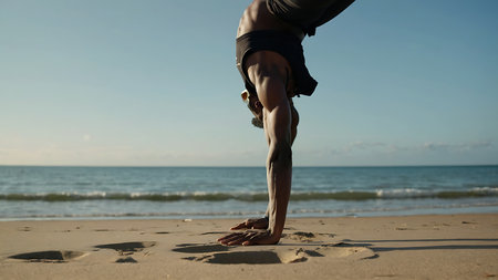Young adult man handstanding at the beach