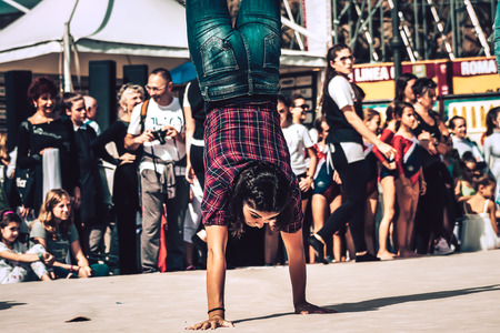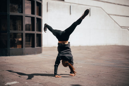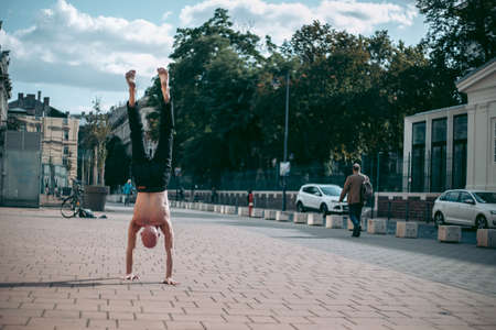 Powerful girl doing advance balance skills in the city. Urban background . Vertical photo.