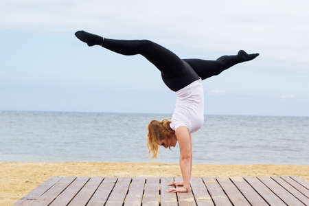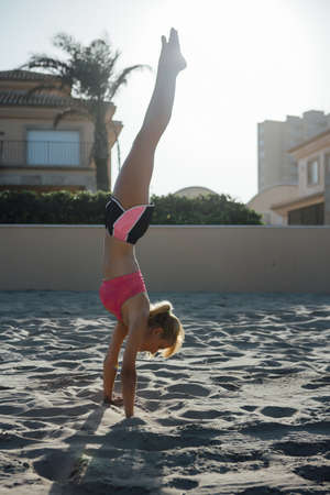 side view of strong blonde woman doing handstand on beach in sunlight