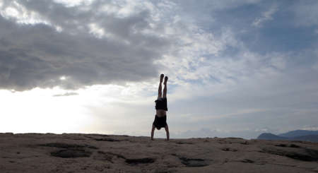 Man doing a hand stand while practicing yoga at dusk