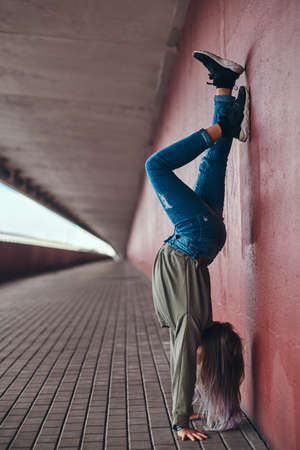 Schoolgirl is standing on her hands leaning against the wall at a bridge footway.