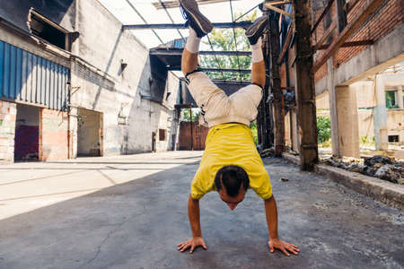 Parkour man in action while training handstand in abandoned factory