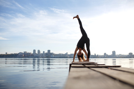 Young woman practicing yoga exercise at quiet wooden pier with city background. Sport and recreation in city rush.