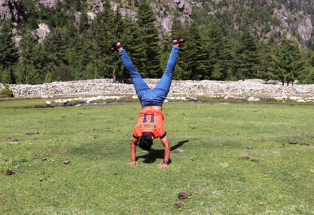 People doing handstand on high altitude grassland on lakeside