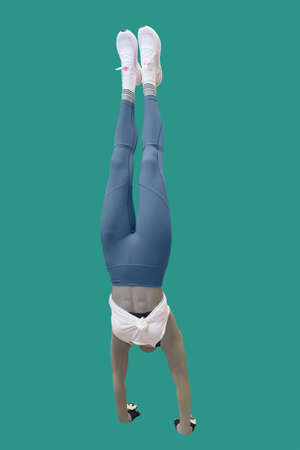 Female mannequin dressed in sportswear, performing a handstand. Isolated on green background. No brand names or copyright objects.