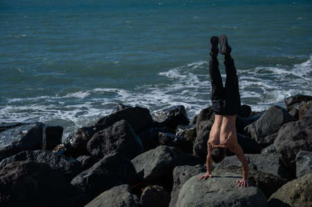 Shirtless man doing handstand on rocks by the sea.