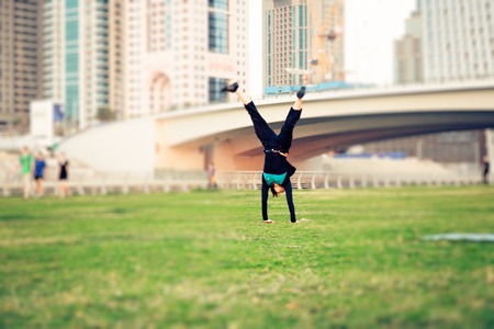 Athletic girl doing stretching exercise and handstand, spring time