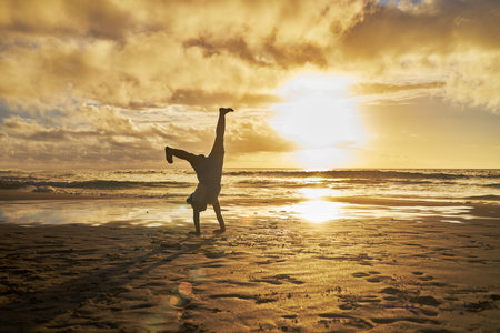 Sunset, silhouette and child doing cartwheel at the beach having fun, playing and enjoy nature. Freedom, inspiration for youth and kid doing handstand by ocean on summer vacation, holiday and weekend