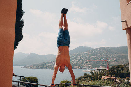 Sporty man stands on hands upside down against France seascape view