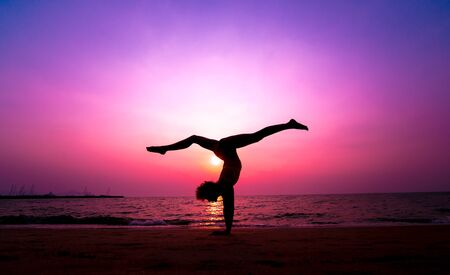 Silhouette of flexible woman gymnast doing handstand on the dramatic sunset. Concept of individuality, creativity and outstanding
