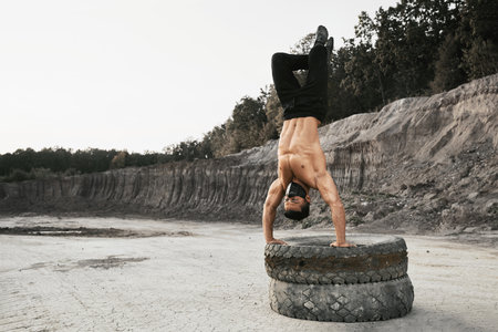 Strong young man with naked torso doing handstand on tyres outdoors. Male bodybuilder training alone in medical mask during quarantine time. Concept of active lifestyle.