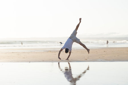Young man doing cartwheel reflecting on wet beach