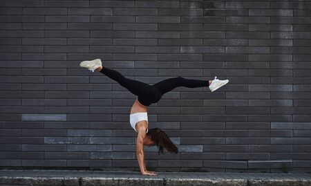 Doing handstand. Young sportive brunette with slim body shape against brick wall in the city at daytime.