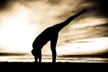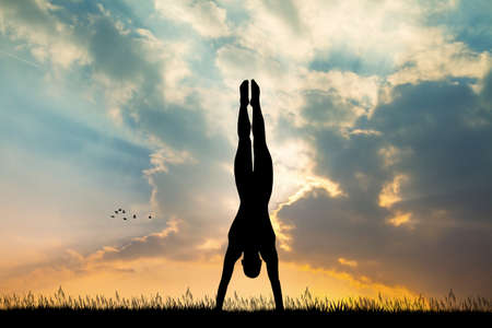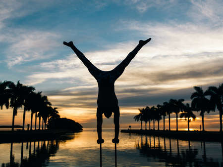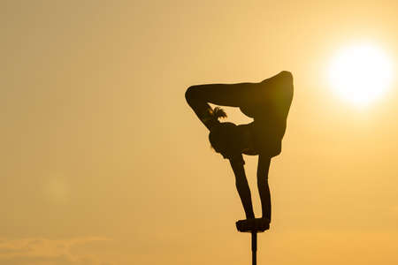 Silhouette of flexible acrobat doing handstand on the dramatic sunset background. Concept of willpower, control and dream