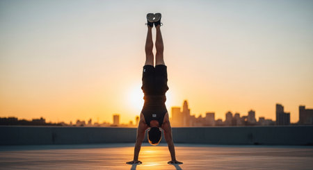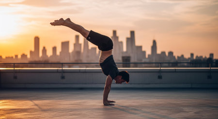 Flexible acrobat doing handstand on the cityscape background during dramatic sunset. Concept of willpower, control and dream