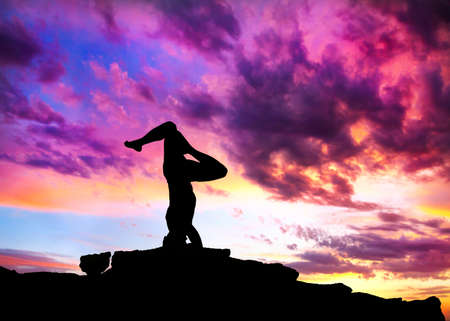 silhouette of a teenage girl exercising, jumping and gymnastics at sunset last night. purple and orange sky in the background.