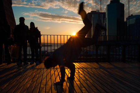 Man dancing on terrace at sunset, Midtown, Manhattan, New York City, New York State, USA