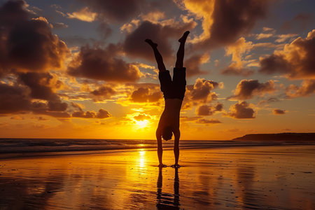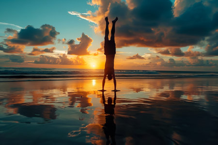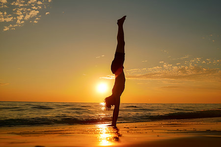 Athletic woman performing a challenging handstand pose on the beach at sunset