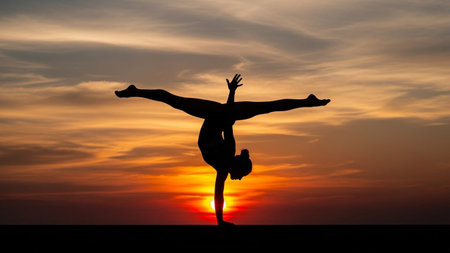 A person in silhouette performs an impressive handstand with legs spread wide against a dramatic, colorful sunset.