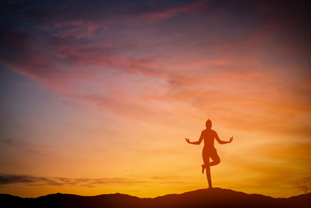 High quality, high resolution, professional yoga woman silhouette at sunset.