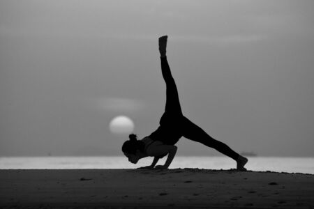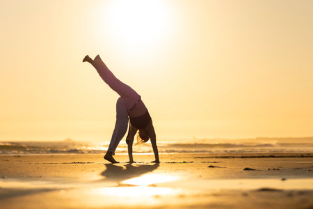 Young woman doing cartwheel near the sea during sunrise time. Stretching in the morning for increasing inner energy.