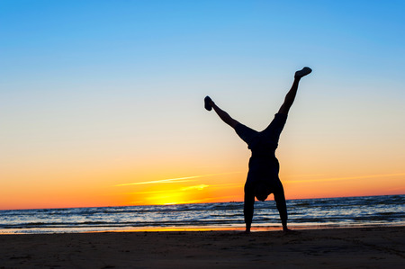 Young sporty man making handstand on the beach. Multicolored sunset background. Horizontal summertime outdoors image.