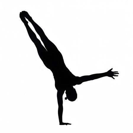 A black silhouette of a gymnast performing a one-handed handstand against a white background.